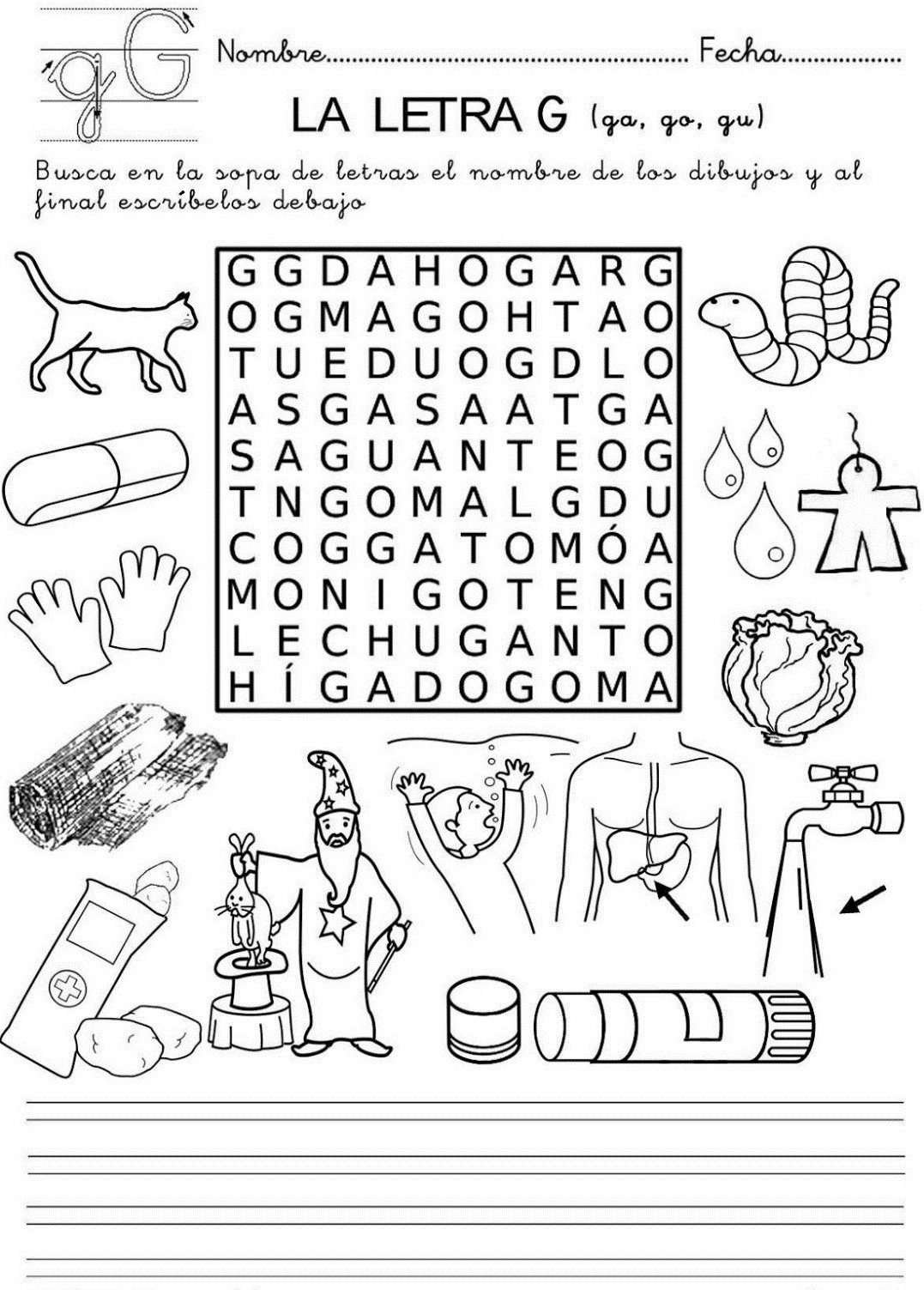 Además de ello, tenéis que completar esta sopa de letras, que incluye otros usos de la g (ga, go, gu). Esta ficha podéis imprimirla y pegarla en vuestro cuaderno o copiar la sopa de letras en el propio cuaderno. ¡Clica en el botón de la derecha!