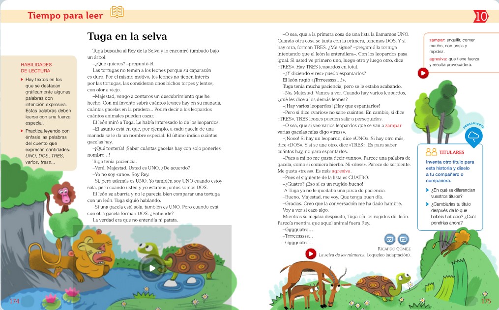 Seguimos otro lunes más con nuestra Lengua, y hoy empezamos el tema 10. Vamos a empezarlo haciendo la lectura de las páginas 174 y 175, titulada "Tuga en la selva".