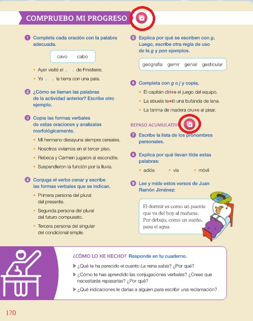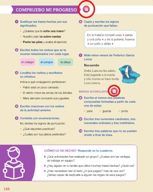De Lengua, tenéis que hacer 4 actividades digitales que os he marcado en rojo en las fotos. Son los "compruebo mi progreso" de las páginas 144 y 170.