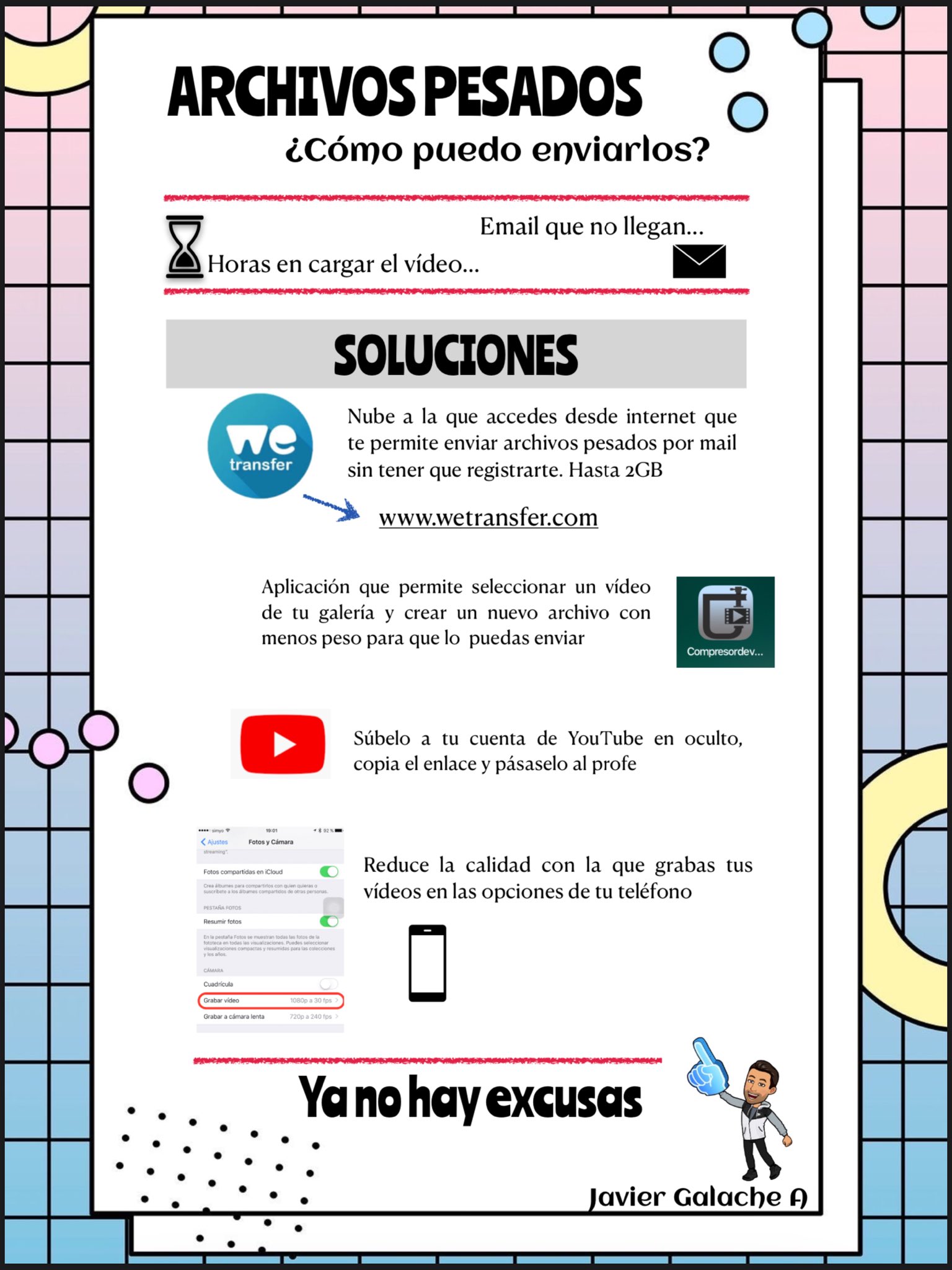 Como los vídeos serán archivos muy pesados, os pongo una foto de Javier Galache, en la explica de manera visual varias opciones para poder enviarme el vídeo.