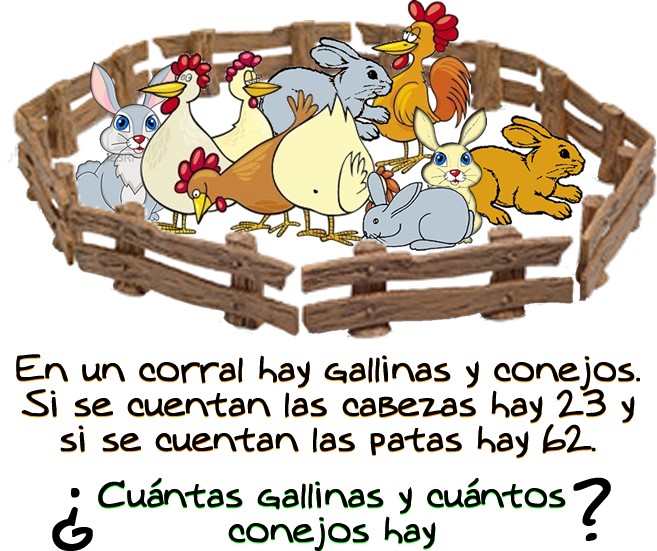 SOLUCIÓN: Hay 15 gallinas y 8 conejos.