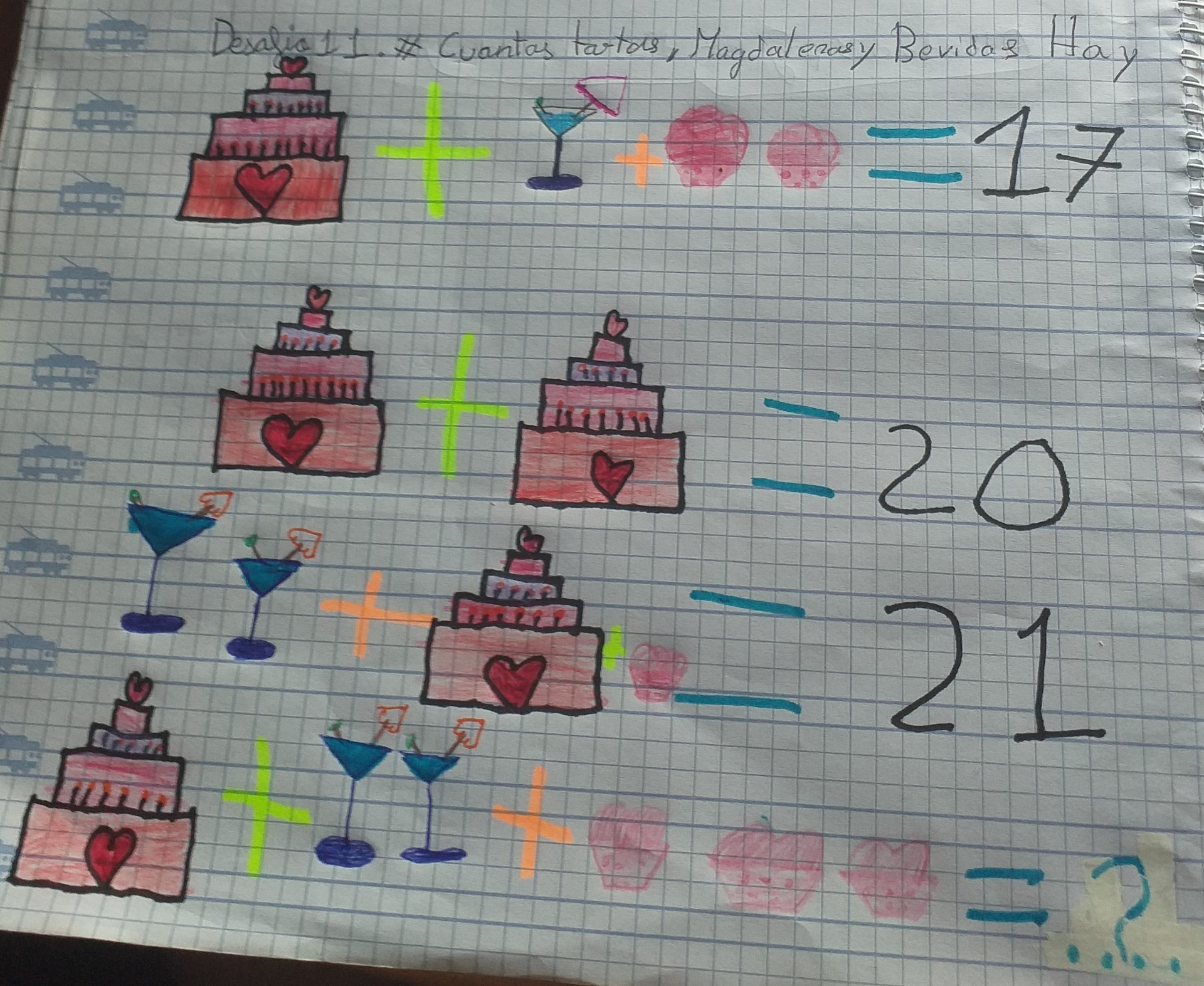 Solución: la tarta vale 10, la bebida vale 5 y las magdalenas valen 1. Por lo tanto, la interrogación vale 10 + 5 + 5 + 1 + 1 + 1 = 23